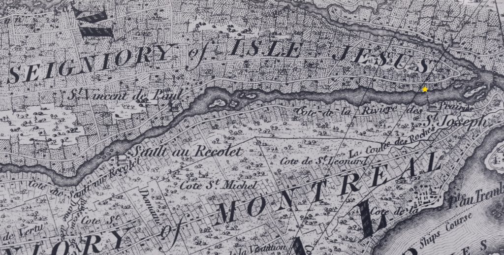 Une bonne partie de ce que l’on sait sur Charles Rhéaume nous vient de la thèse de doctorat de Sylvie Dépatie, qui a travaillé sur la population et l’administration de la seigneurie de l’île Jésus au cours des années 80[2]. Elle trace le portrait d’un commerçant prospère, et surtout du premier détaillant de l’île Jésus. Beaucoup de biens transitaient par ses propriétés, et l’acquisition de lots dans la paroisse reflétait bien ses ambitions. Sa femme, Marguerite-Madeleine Labelle, est la fille d’un des hommes les plus riches de l’île Jésus, et sa terre a la chance d’être située aux abords d’une petite baie, assez profonde pour que de grosses barques y mouillent. Elle constitue un port naturel parfait, et Charles Rhéaume en a très bien conscience[3]. Il y fait éventuellement construire deux hangars[4]. Ce terrain a un autre avantage : il est situé juste à côté du moulin de Saint-François (représenté par une étoile jaune sur la carte ci-dessus).