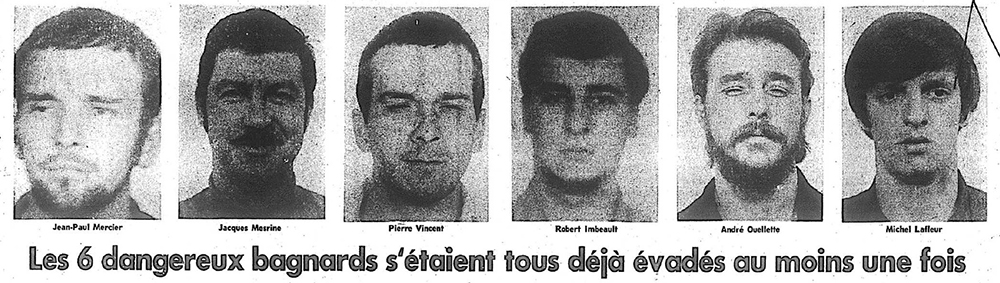[3] Dans les années 1960, l’hémorragie se poursuit. Le célèbre Lucien Rivard, entre autres, s’évade de Saint-Vincent-de-Paul en 1965 après qu’on lui ait permis d’arroser la patinoire, et Yves Geoffroy en 1972 après avoir obtenu la permission de sortir temporairement pour marier sa fiancée. « Diefenbaker réclame la démission de Goyer ». Le Devoir, 15 janvier 1972, p. 1. Juste après l’évasion de Mesrine et de ses compagnons, plusieurs autres détenus parviennent à s’enfuir de l’Institut Leclerc, attenant à l’USC. « Évasion » La Presse, 30 octobre 1972, p. A6.