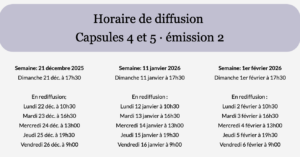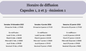 Veuillez noter que certaines capsules seront diffusées une à la suite de l’autre dans un même bloc :